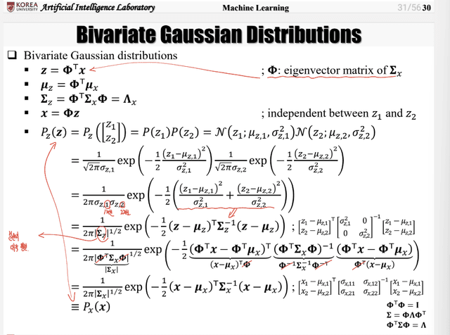 : 이므로, 곧 이는 새로운 Domain에서 바라보는 Covariance Matrix임을 의미한다. 이 때, Eigenvalue Matrix는 Diagonal 행렬이므로 이는 다른 축과의 Correlation이 없음을 의미한다.