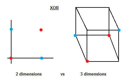 - 이 때, 기존의 의 차원보다 커지게 되며, 위의 xor문제에서는 2차원에서 3차원으로 변한다.